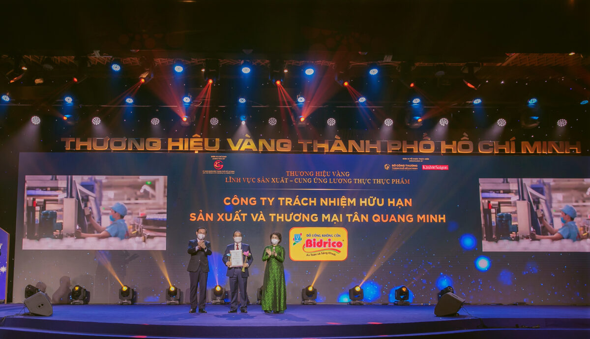 Trong số 30 doanh nghiệp đạt giải năm nay nước giải khát Bidrico Tân Quang Minh đã vinh dự và được trao tặng danh hiệu Thương Hiệu Vàng của Thành phố Hồ Chí Minh. Suốt 30 năm hình thành và phát triển, Bidrico đã trở thành một trong những thương hiệu nước giải khát uy tín tại Việt Nam gắn với các nhãn hiệu Restore, Nước tinh khiết, A*nuta, Bi’s Nest, YoBi, Bi-coffee. Với hệ thống nhà phân phối trải dài trên cả nước. Riêng sản phẩm nước bình 19L có hơn 1000 đại lý khu vực Tp. HCM và các vùng lân cận. Đặc biệt sản phẩm Bidrico đã xuất khẩu sang nhiều quốc gia có tiêu chuẩn khắt khe. Bidrico đã xác định được cho mình hướng đi rõ ràng tạo được sự tin tưởng của khách qua chất lượng sản phẩm và cả dịch vụ chăm sóc khách hàng.