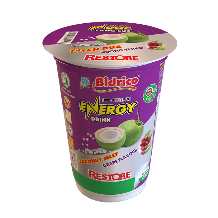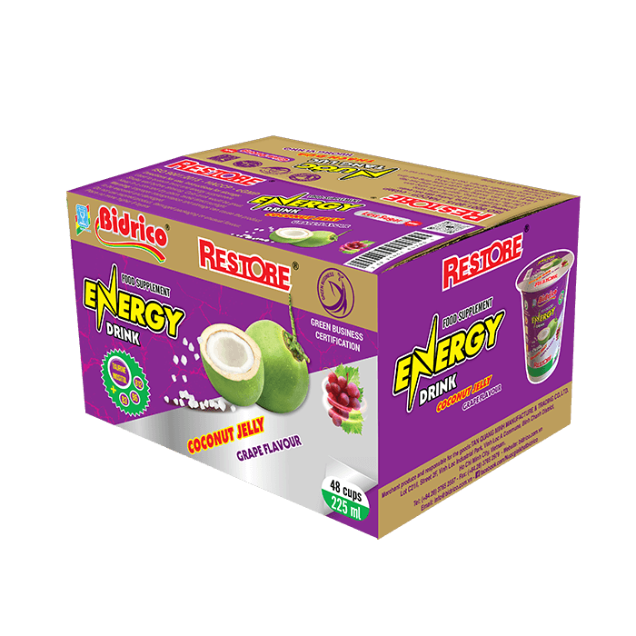 With a compact and convenient design, the product is contained in a 225ml cup, easy to take away when doing outdoor activities. Along with a safe and hygienic production system, Restore energy drink coconut jelly grape flavour confidently brings customers good and quality product experiences.