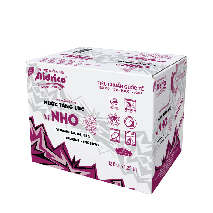 Các hương vị nước tăng lực Bidrico chai 1.25l: Trái cây, Nho, Dâu.